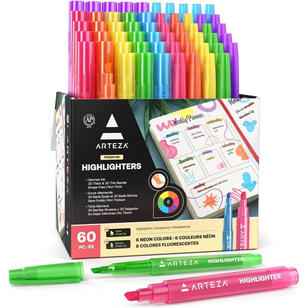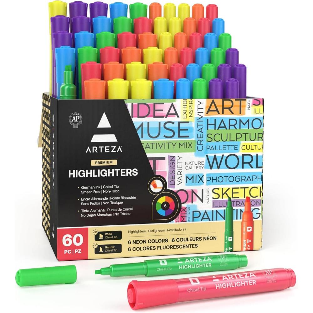 ARTEZA Highlighters – Bulk Set of 60 Neon Colors with Broad and Narrow Chisel Tips, Non-Toxic Quick-Dry Markers for School, Office, Journaling & Notes(1 Count (Pack of 60))