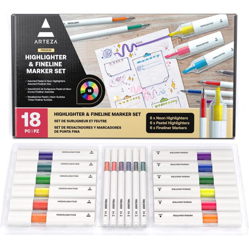 ARTEZA Gel Highlighters and Black Pens – 24-Pack with Sharpener, Smudge-Free, No-Bleed, for Thin Pages, Journaling, Note-Taking, School and Office Use