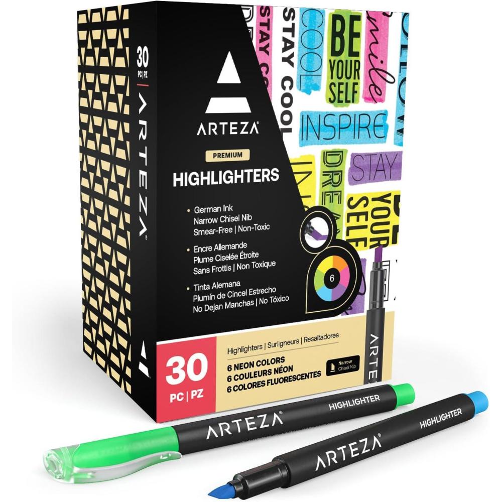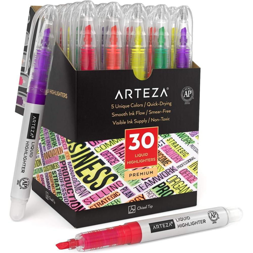 ARTEZA Liquid Highlighter Pens, Set of 30, Narrow Chisel Tip, 5 Assorted Colors(Assorted Colors)