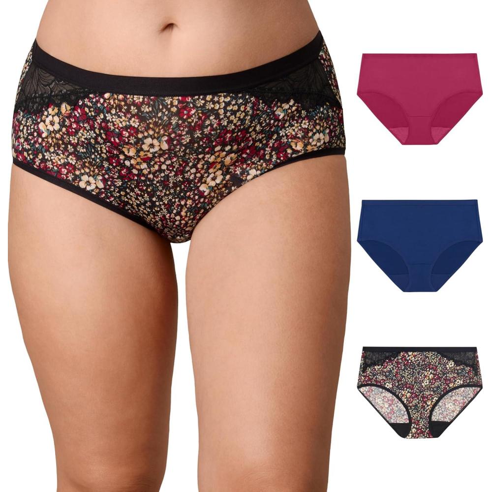 PLAYTEX womens Microfiber Hipster Underwear Pack, Plus-size Underwear Available, Full Coverage, Moisture-wicking, 3-pack(Digital Rose/Sail Away Navy/Noten Floral Print)