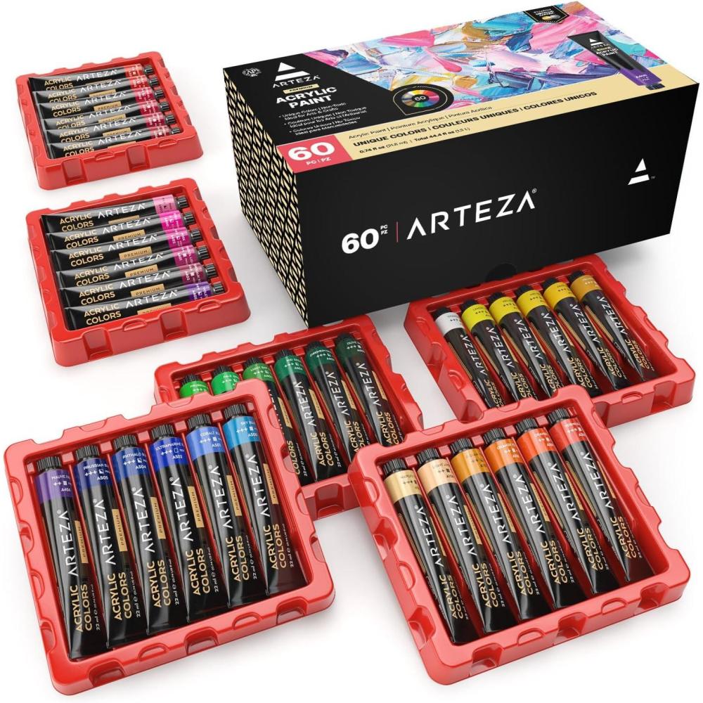 ARTEZA Acrylic Paint Set of 60 Colors, 0.74 ounces Tubes, 5 Metallic Colors Acrylic Paints, Non-Toxic Artist Paints. Art Supplies for Painting(0.74 Fl Oz (Pack of 60))