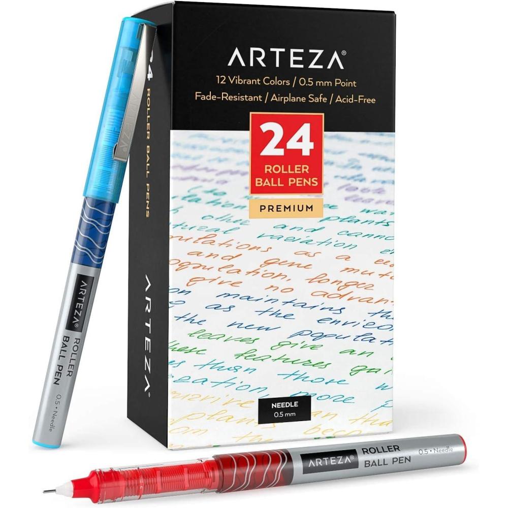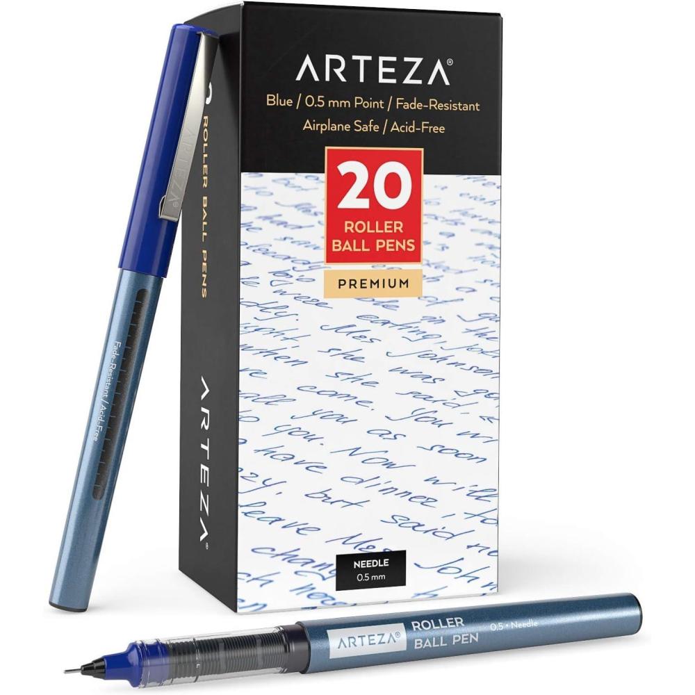 ARTEZA Rollerball Pens Fine Point, Set of 20 Blue Liquid Ink, Extra Fine 0.5 mm Needle Tip Pen, Make Precise Lines, Office Supplies for Writing, Notetaking, and Drawing(Multicolor)