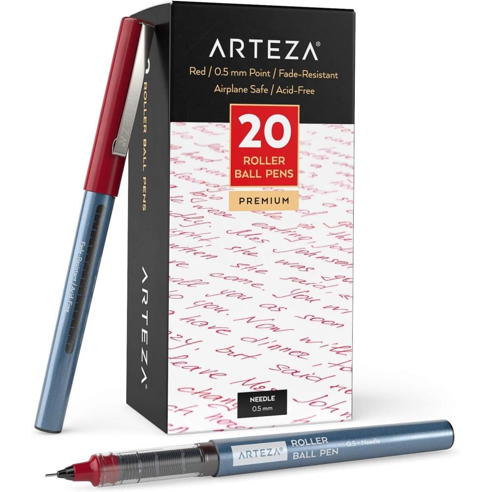 ARTEZA Rollerball Pens Fine Point, Set of 20 Blue Liquid Ink, Extra Fine 0.5 mm Needle Tip Pen, Make Precise Lines, Office Supplies for Writing, Notetaking, and Drawing(Red)