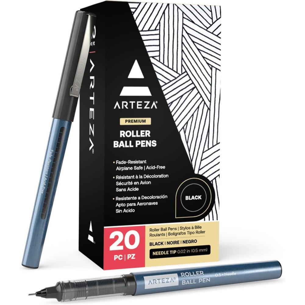 ARTEZA Rollerball Pens Fine Point, Set of 20 Blue Liquid Ink, Extra Fine 0.5 mm Needle Tip Pen, Make Precise Lines, Office Supplies for Writing, Notetaking, and Drawing(Black)