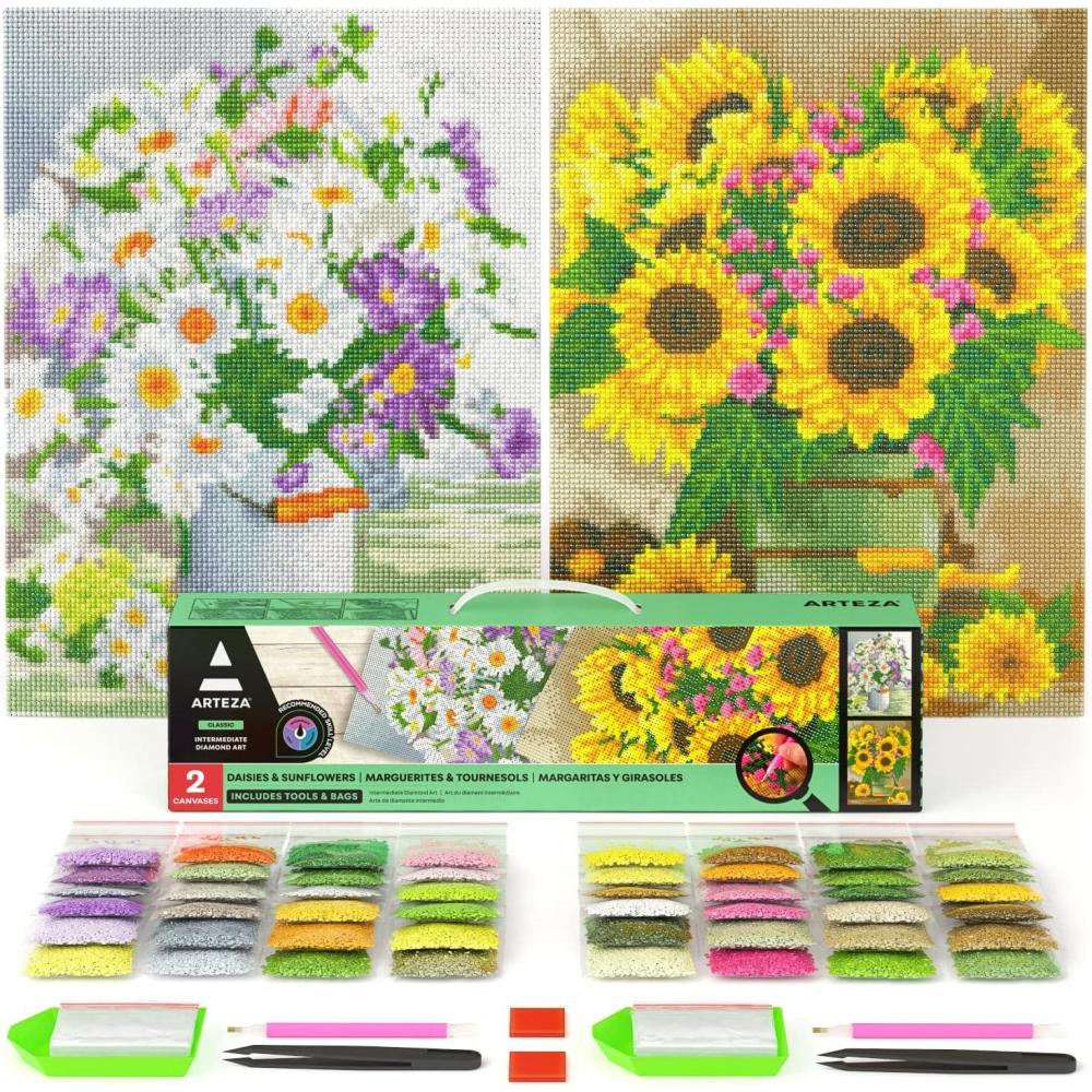 Arteza 5D Diamond Painting Kit, 2-Pack, Floral Designs, Full-Drill Diamond Art for Adults, 12 x 16 Inches Canvases, Round Rhinestones, & Painting Accessories, Bead Art Craft Supplies(Daisy and Sunflower)