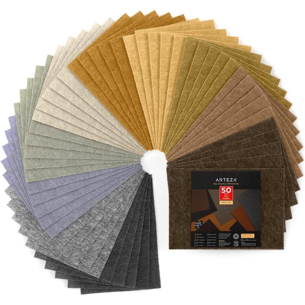 Arteza Craft Felt Sheets, Set of 50, 8.3 x 11.8 inches, 10 Brown and Gray Tones, 20 Soft and 30 Stiff Non Woven Felt Fabric Squares, 1.5mm and 1.3mm Thick, Sewing Fabric for DIY Projects