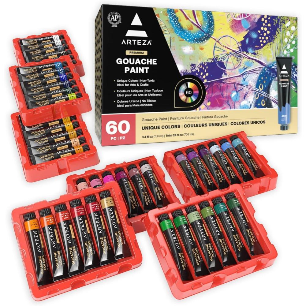 ARTEZA Gouache Paint, Set of 60, 12ml/0.4 US fl oz Gouache Paint Tubes for Professionals and Students(PAINT)