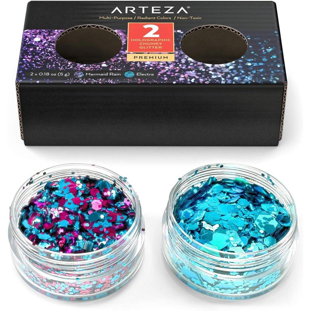 Arteza Chunky Glitter, Set of 2 Colors, 5 g Jars, Holographic Glitter in Mermaid Rain and Electra Tones, Art Supplies for DIY Craft Projects