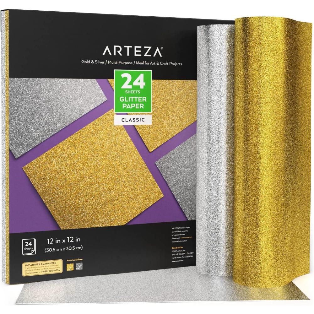 Arteza Glitter Paper, 24 Sheets, 12 x 12 Inches, Gold and Silver Scrapbook Paper, Arts and Crafts Supplies for Holiday Decor, Decoupage, and DIY Projects(Gold & Silver)