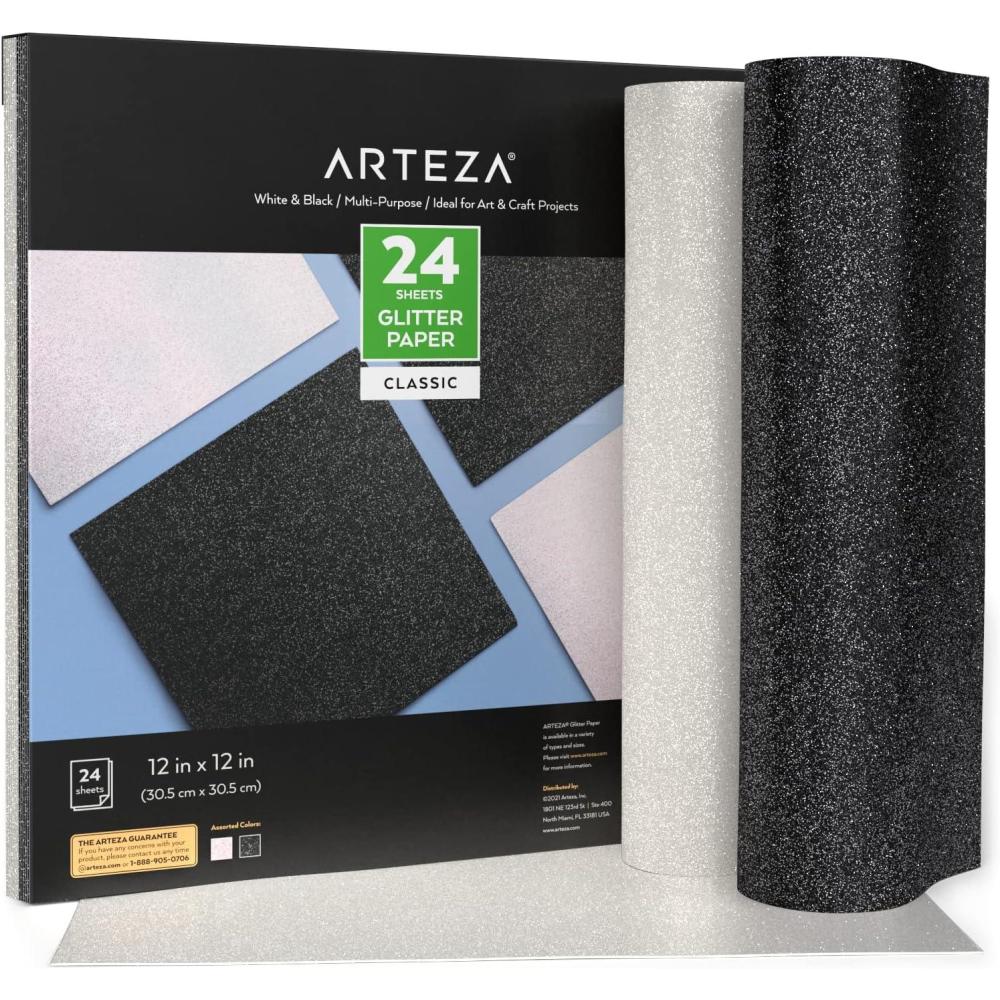 Arteza Glitter Paper, 24 Sheets, 12 x 12 Inches, Gold and Silver Scrapbook Paper, Arts and Crafts Supplies for Holiday Decor, Decoupage, and DIY Projects(White & Black)