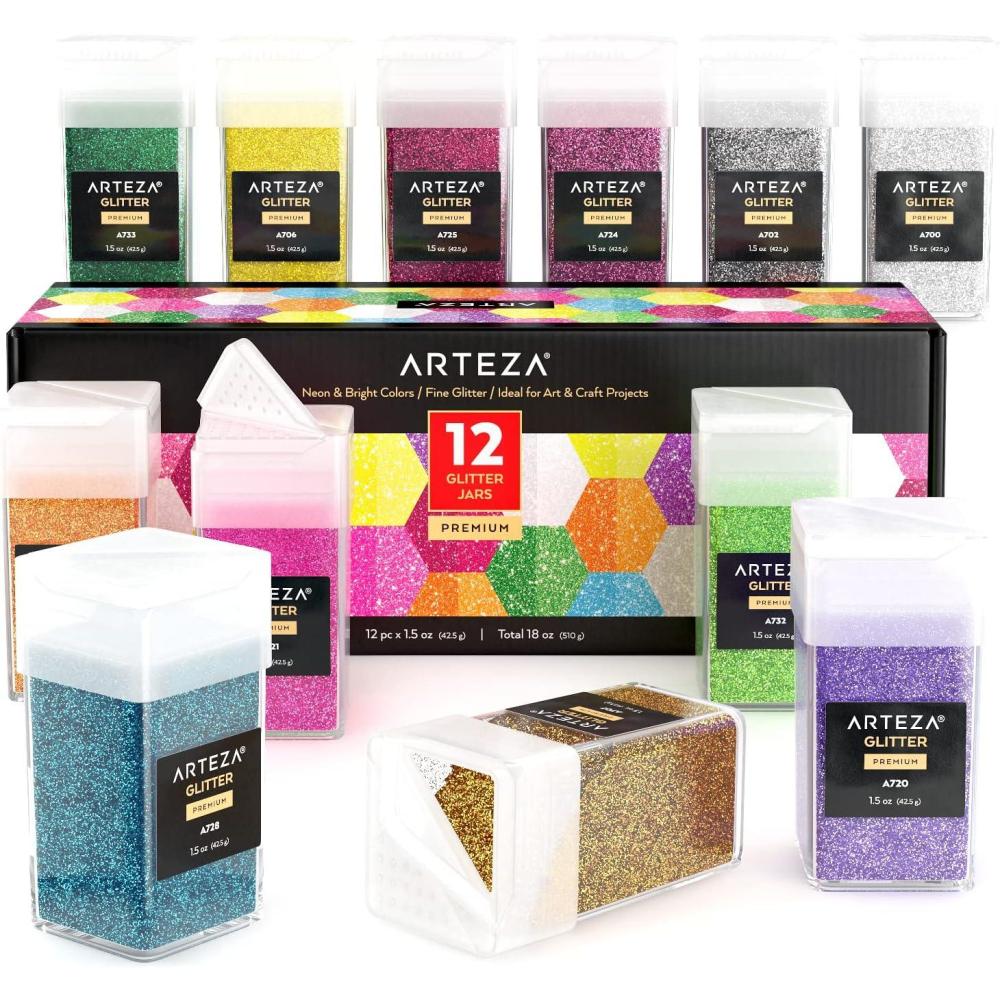 Arteza Fine Glitter, Set of 54 Colors, Shaker Jars (0.34oz/9.6 g) Glow Under UV Black Light, Extra Fine, Art Supplies for DIY Crafts