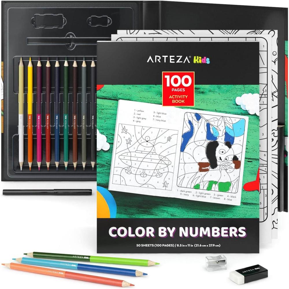 ARTEZA Kids Coloring Book and Colored Pencils Kit, 8.5×11 Inches, Sea Creature Illustrations, 50 Double-Sided Coloring Sheets, 100-lb Paper(Color-by-Number)
