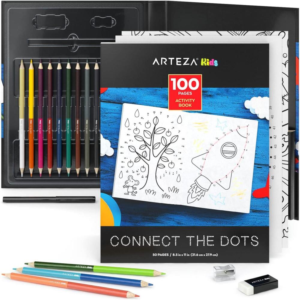 Arteza Kids Activity Book, Dot to Dot Coloring Book, 8.5 x 11 Inches, Back to School Supplies for Ages 6 and Up, 50 Sheets, 12 Double-Ended Colored Pencils, Black Marker, Eraser, Pencil Sharpener
