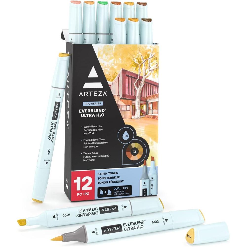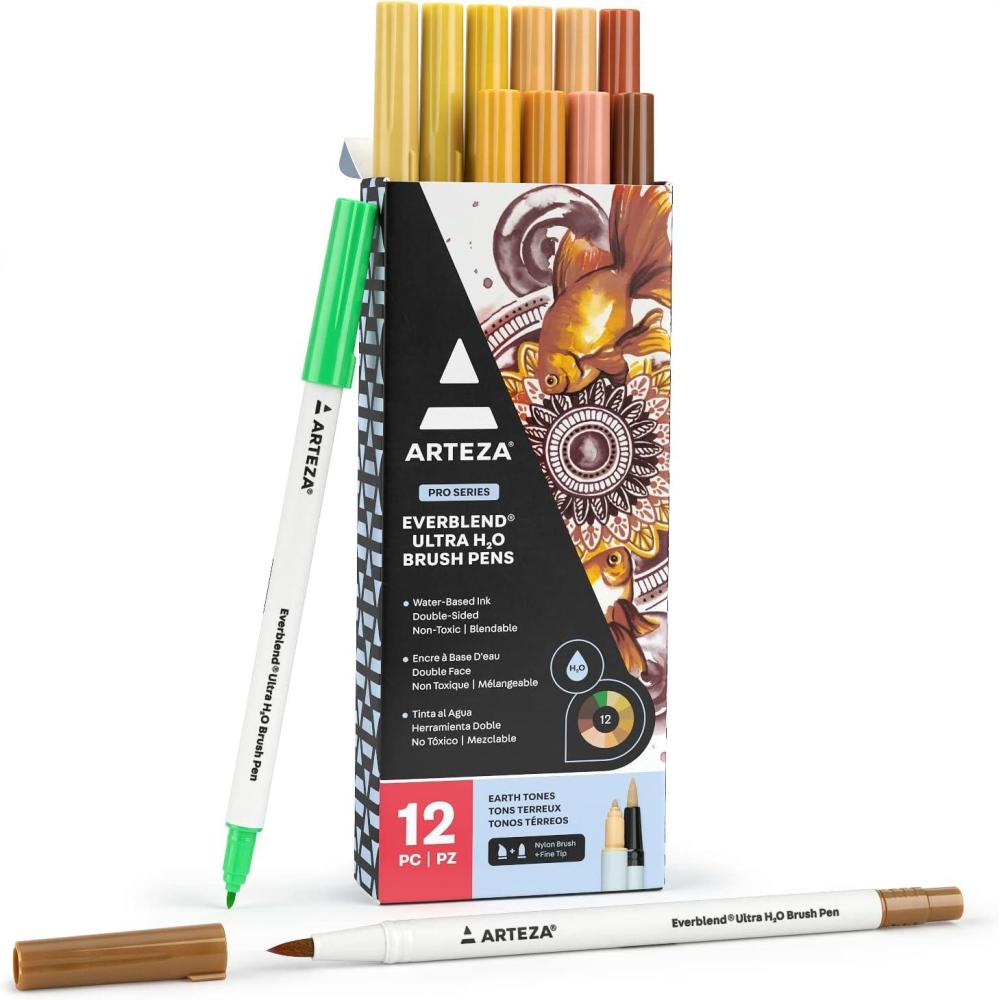 ARTEZA Dual Tip Brush Pens, 12 Earth Tones, Watercolor Calligraphy Markers, Nylon Brush and Fine Tip, Water-Based Ink, for Illustration, Lettering