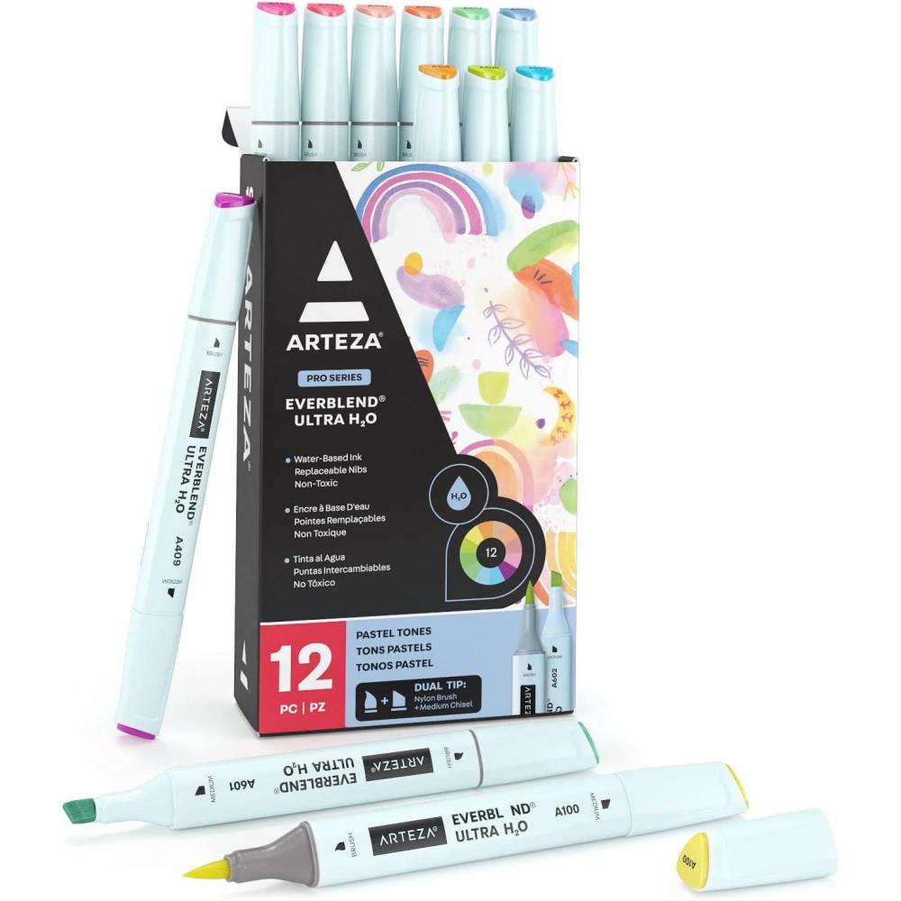 ARTEZA Dual Tip Brush Pens, 12 Vintage Tones, EverBlend Watercolor Calligraphy Markers, Nylon Brush and Medium Chisel Nib, Water-Based Ink(12 Pastel Tones)