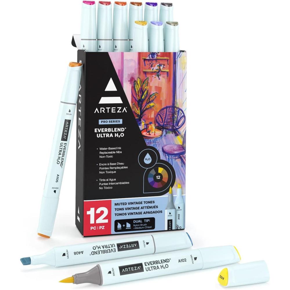 ARTEZA Dual Tip Brush Pens, 12 Vintage Tones, EverBlend Watercolor Calligraphy Markers, Nylon Brush and Medium Chisel Nib, Water-Based Ink(12 Vintage Tones)