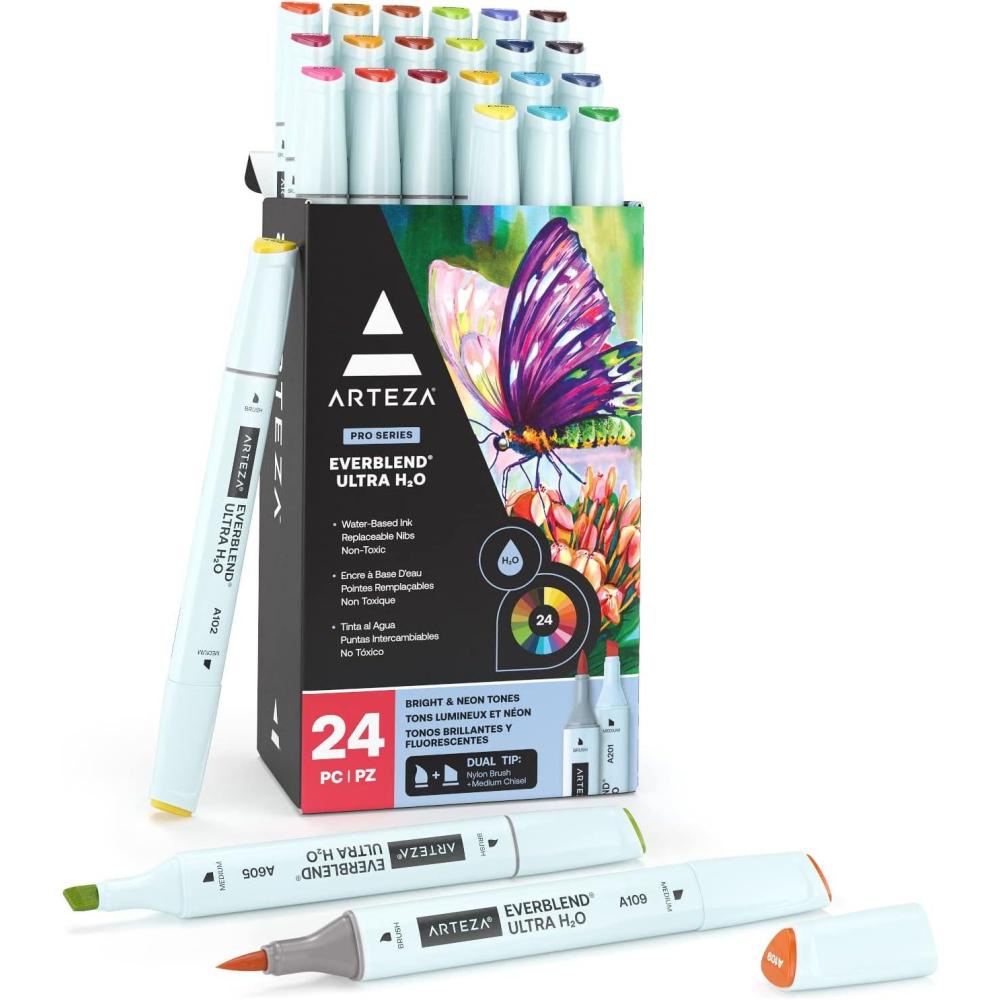ARTEZA Dual Tip Brush Pens, 12 Vintage Tones, EverBlend Watercolor Calligraphy Markers, Nylon Brush and Medium Chisel Nib, Water-Based Ink(24 Bright and Neon Tones)
