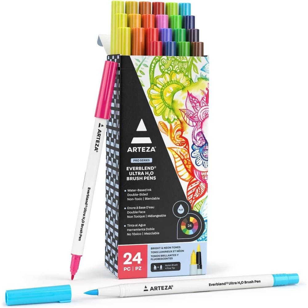 ARTEZA Dual Tip Brush Pens, 24 Watercolor Calligraphy Markers, Bright and Neon Tones, Nylon Brush and Fine Tip(Brights & Neons)