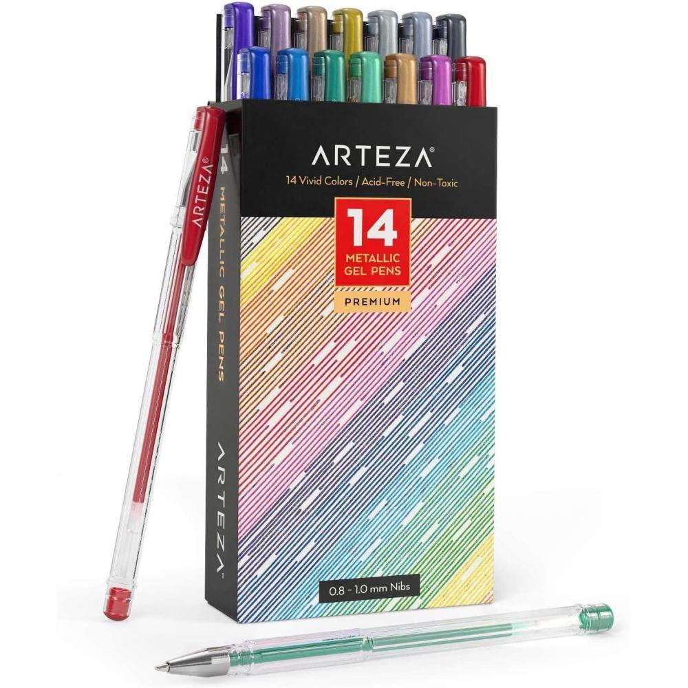 ARTEZA Glitter Gel Pens, Set of 14 – Colored Ink Markers with Triangular Grip, 0.8–1.0 mm Tip for Adult Coloring, Drawing & Decorative Writing(Metallic)