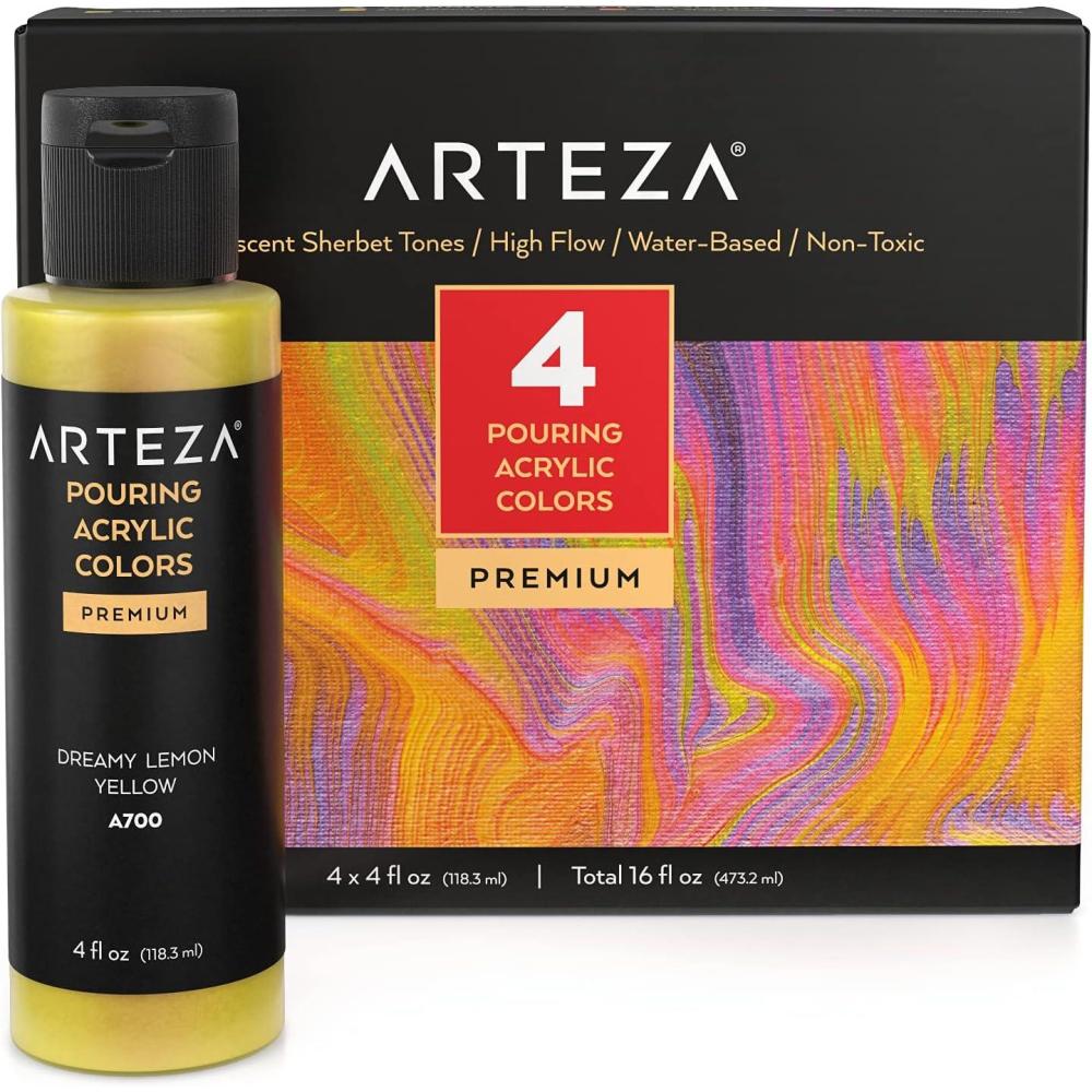 ARTEZA Iridescent Acrylic Paint Set – 10 Galaxy Tones, Shimmer Water-Based Paints for Canvas, Wood, Rocks, Fabrics, and Mixed Media Projects(4 x 118ml (4 fl oz) Sherbet Tones)