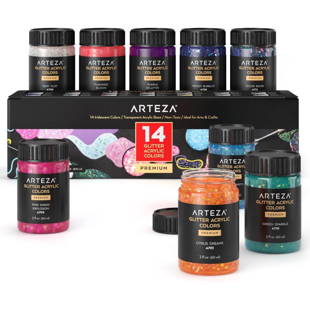 ARTEZA Glitter Acrylic Paint, 14 Iridescent Colors, 2 fl oz Bottles, Transparent Base, Iridescent Paint with Chunky Glitter, Art Supplies for Adding Accents to Canvas, Paper, Wood, and Glass