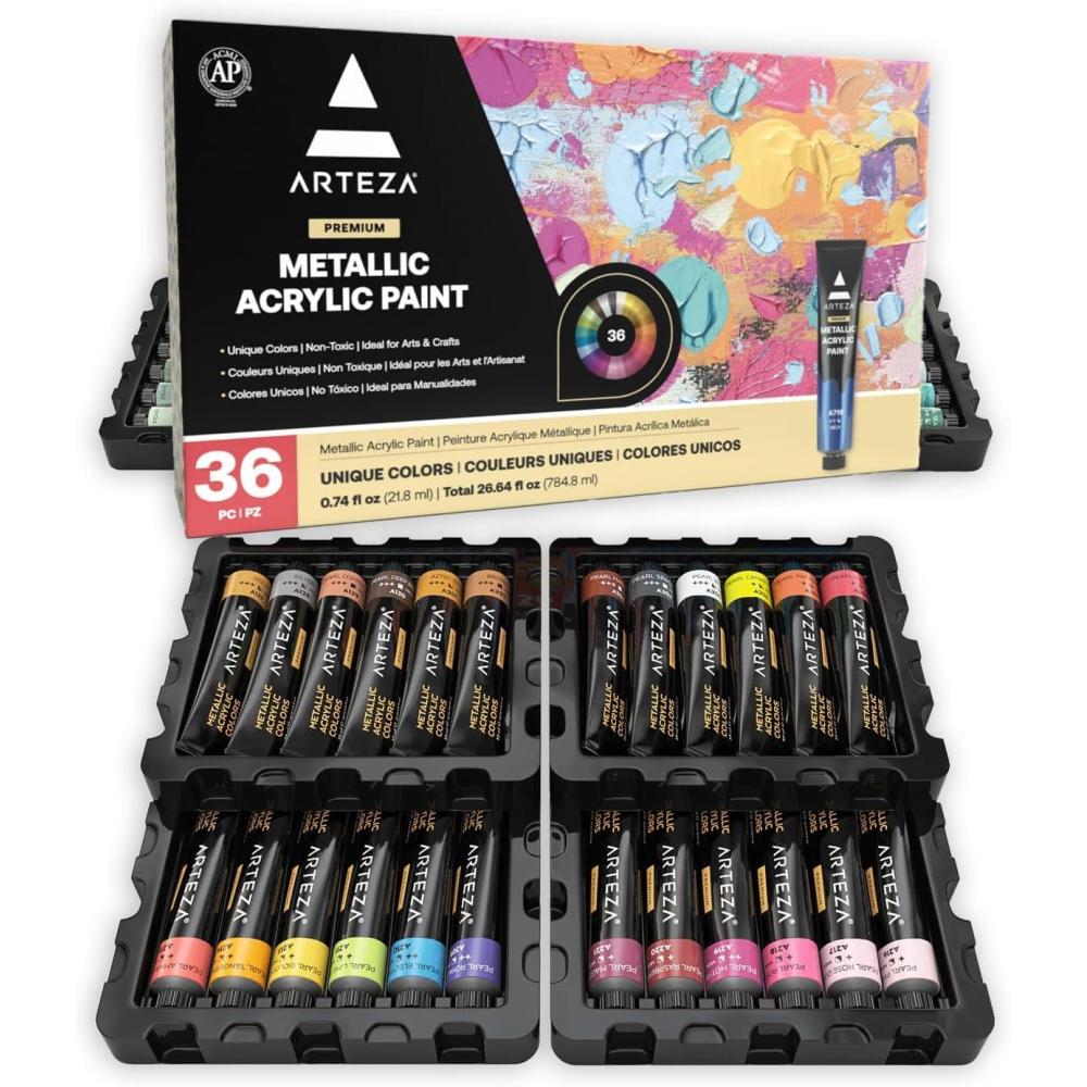 ARTEZA Metallic Acrylic Paint Set of 12 Colors, 0.74 ounce Tubes Non Toxic Artist Paints for Hobby Painters, Art Supplies for Canvas Painting(Multicolor)