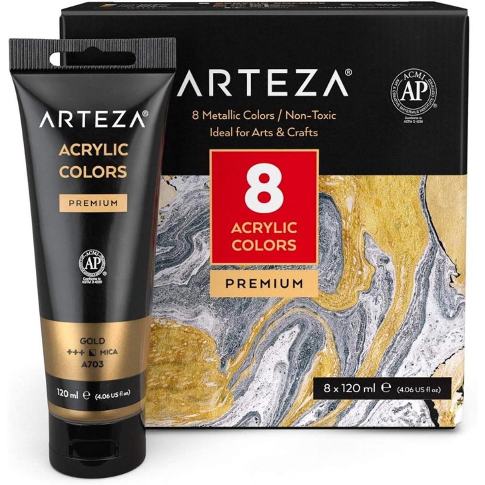 ARTEZA Pastel Acrylic Paint, Set of 8, Metallic Tones, 4.06 fl oz Tubes, High Viscosity Water-Based Paint, Glossy Finish, Art Supplies for Painting Paper, Canvas, Wood and Fabric, and DIY Projects(8 x 120ml (4.06 fl oz) Metallic)