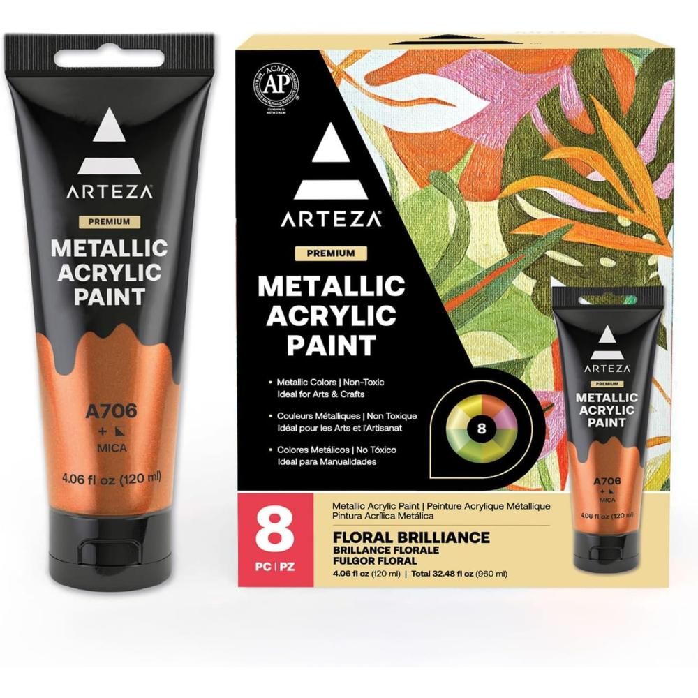 ARTEZA Pastel Acrylic Paint, Set of 8, Metallic Tones, 4.06 fl oz Tubes, High Viscosity Water-Based Paint, Glossy Finish, Art Supplies for Painting Paper, Canvas, Wood and Fabric, and DIY Projects(8 x 120ml (4.06 fl oz) Floral Brilliance)