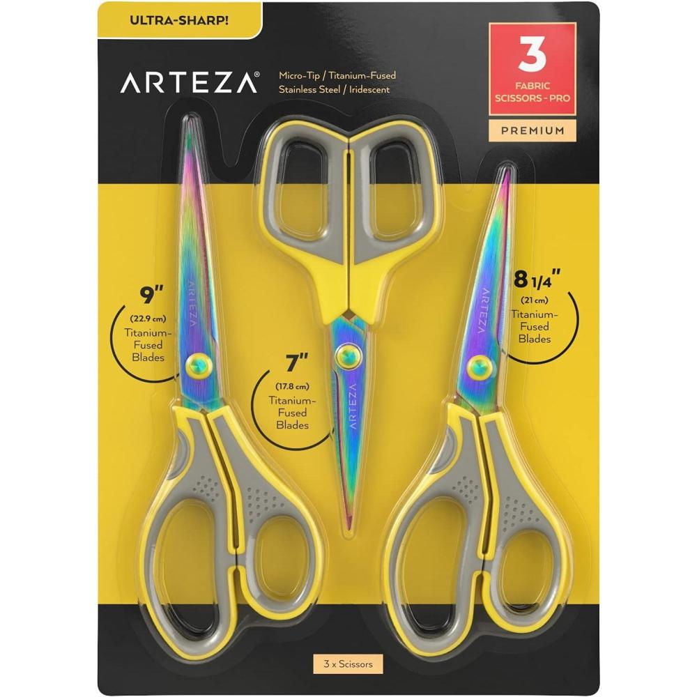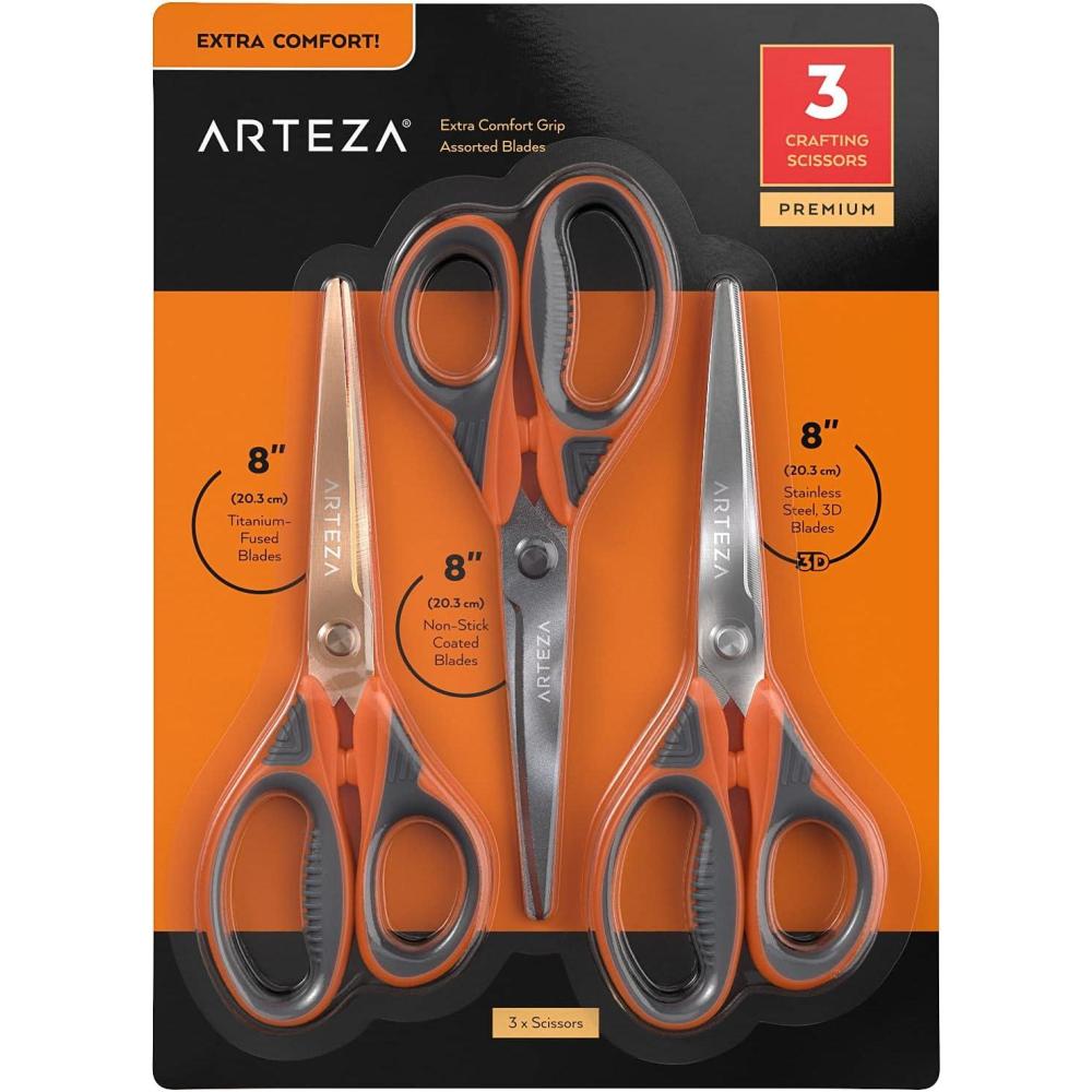 Arteza Craft Scissors, Set of 3, 8-Inch Scissors with Different Blades, Titanium Nonstick Stainless Steel Blades, Craft Supplies for Scrapbooking, Building Models, and Cutting Felt Designs(Fabric)