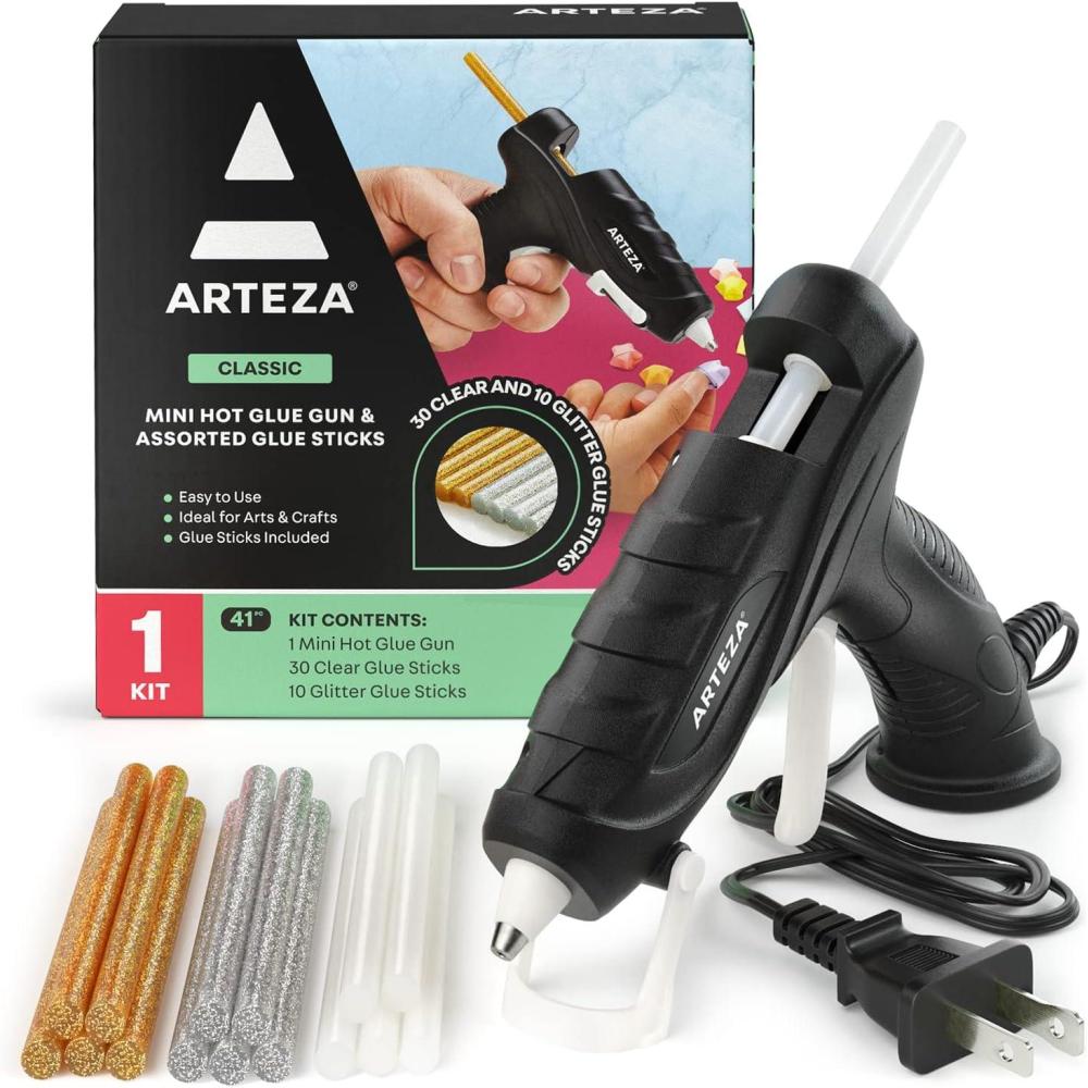ARTEZA Mini Glue Gun for Crafting, 20W, 30 Clear and 10 Glitter Glue Sticks, Built-in Stand, Craft and Scrapbooking Supplies(20W)