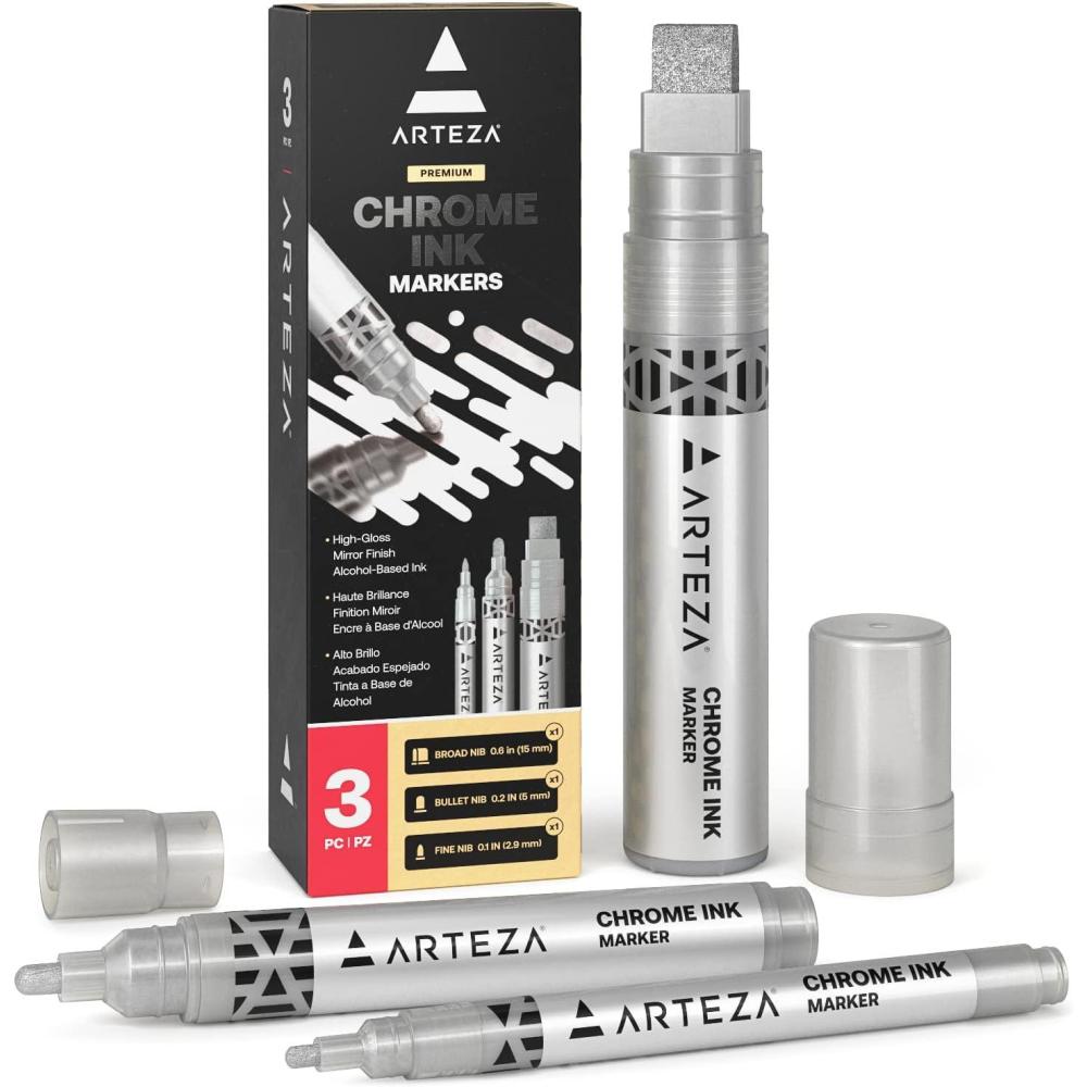 ARTEZA Mirror Chrome Marker Set, 3 Pack, 2.9mm, 5mm & 15mm Nibs, Hi-Gloss Silver Metallic Pens(1 Count (Pack of 3))