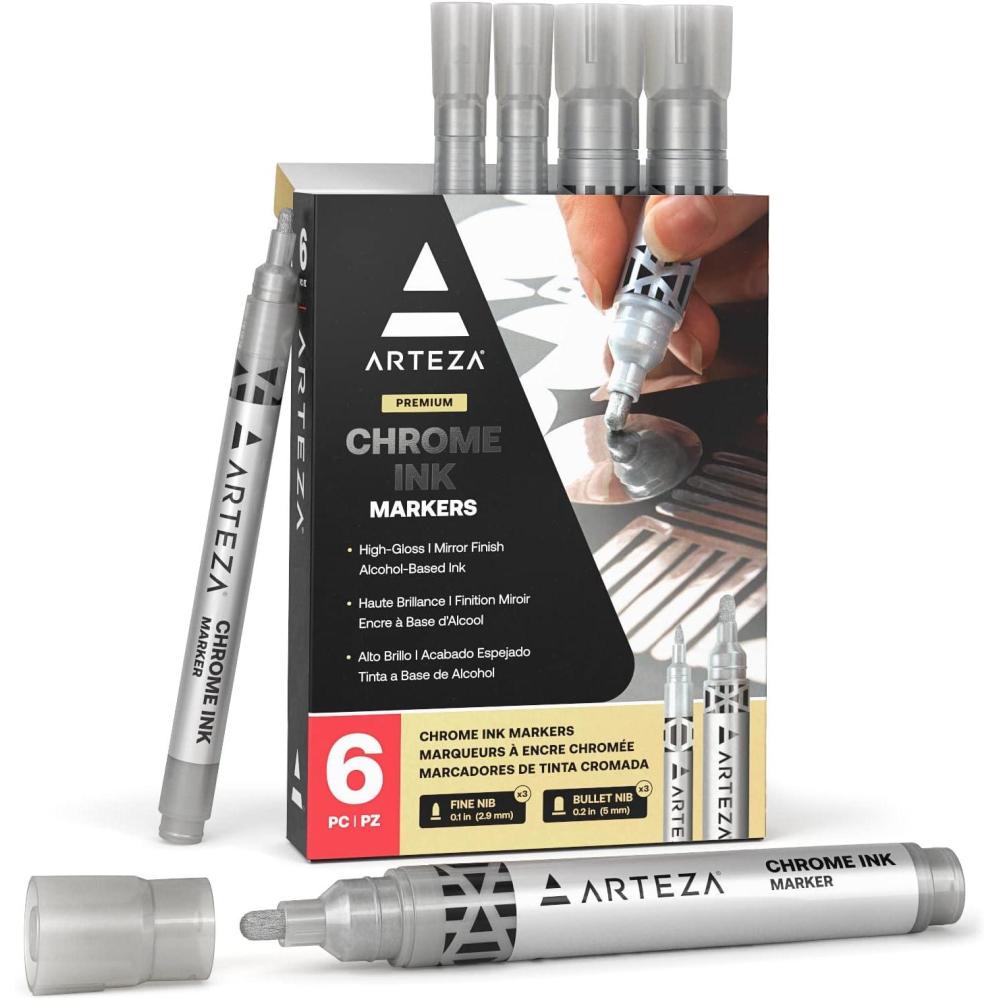 ARTEZA Mirror Chrome Marker Set, 3 Pack, 2.9mm, 5mm & 15mm Nibs, Hi-Gloss Silver Metallic Pens(1 Count (Pack of 6))