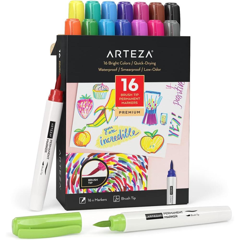ARTEZA Permanent Markers – Set of 80 with 61 Assorted Colors, Low-Odor Quick-Dry Paint Pens, Broad, Fine, and Brush Tip for Arts, Crafts & Labeling(16 Brush Tip Pens)