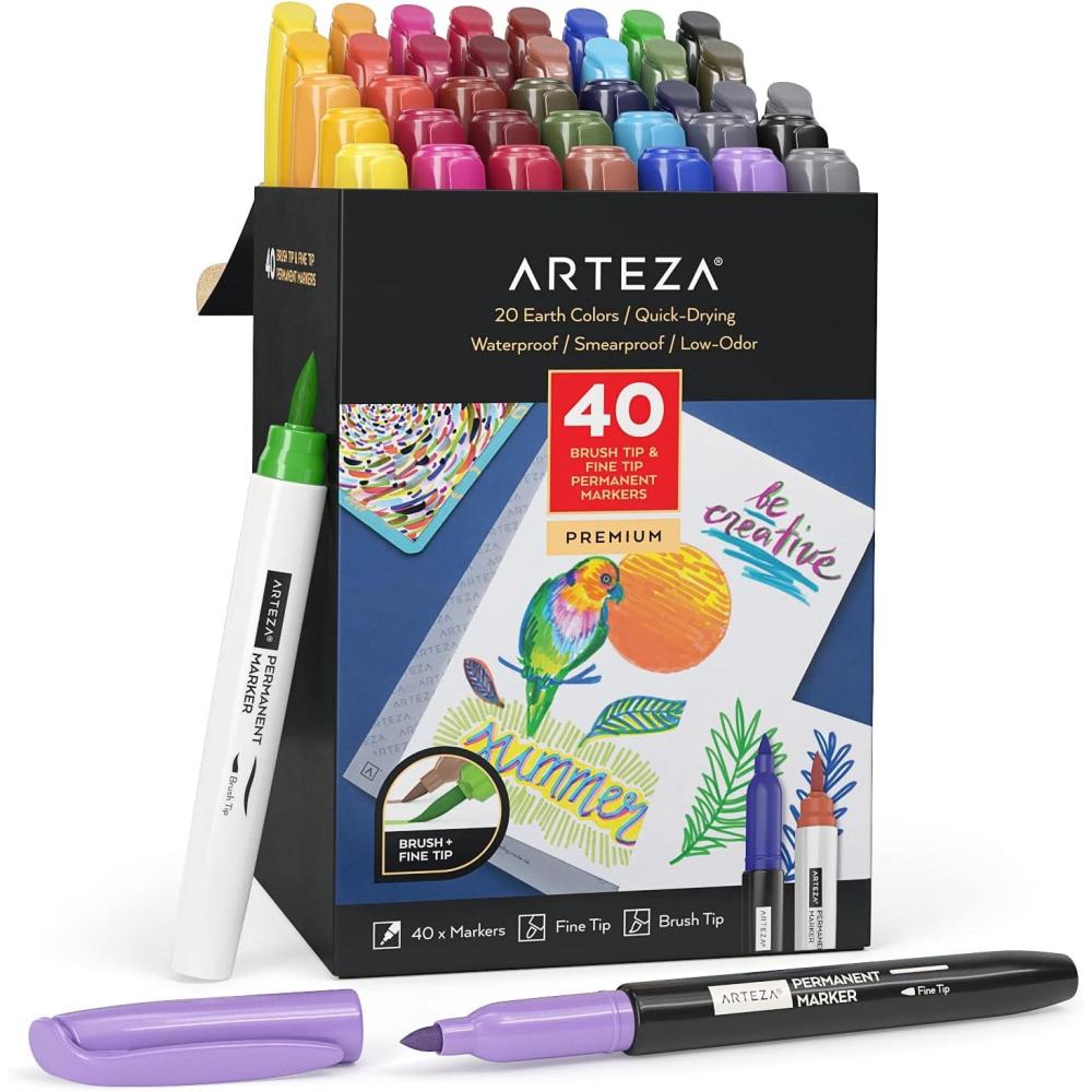 ARTEZA Permanent Markers – Set of 80 with 61 Assorted Colors, Low-Odor Quick-Dry Paint Pens, Broad, Fine, and Brush Tip for Arts, Crafts & Labeling(40 Brush & Fine Tip)