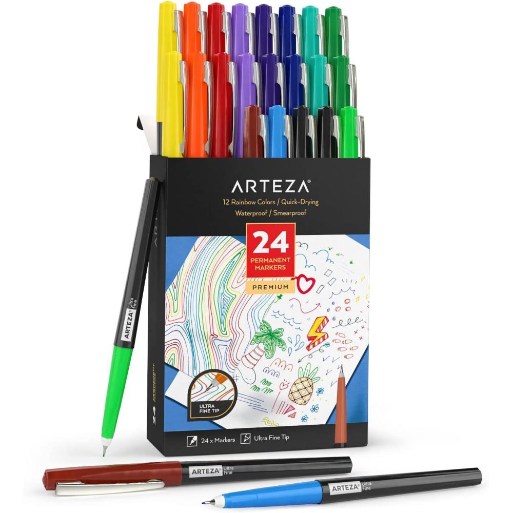 ARTEZA Permanent Markers, 40 Black Pens, Ultra-Fine Tip Paint Pens, Quick-Drying, Water Resistant, for Calligraphy and Note Taking, Office, Classroom(Set 24 12 Rainbow Colors)