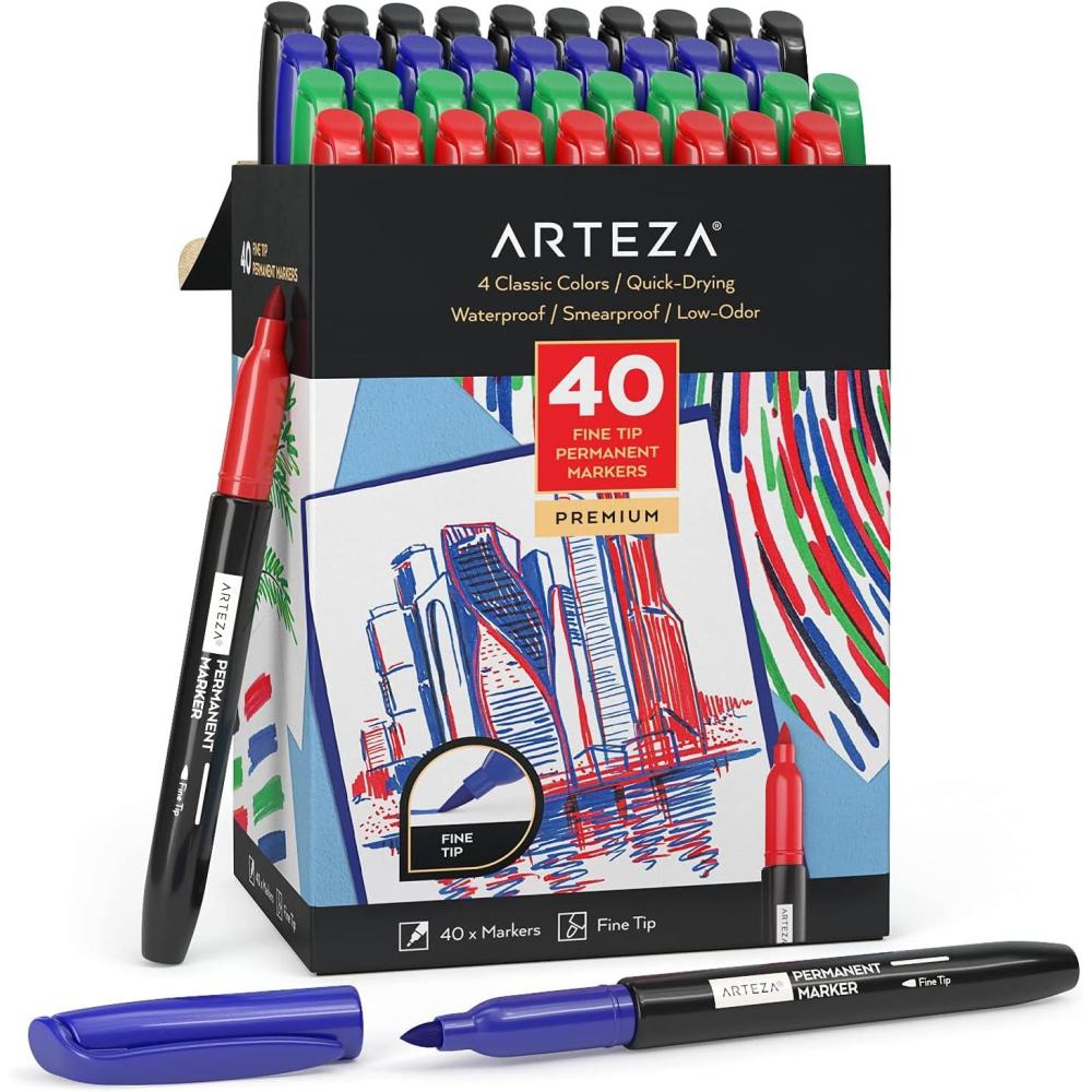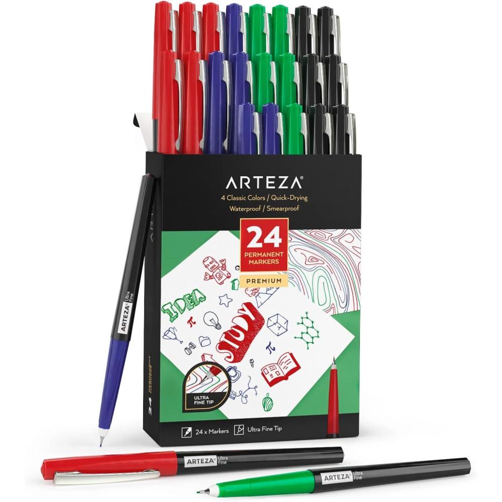 ARTEZA Permanent Markers, 40 Black Pens, Ultra-Fine Tip Paint Pens, Quick-Drying, Water Resistant, for Calligraphy and Note Taking, Office, Classroom(Set 24 4 Classic Colors)