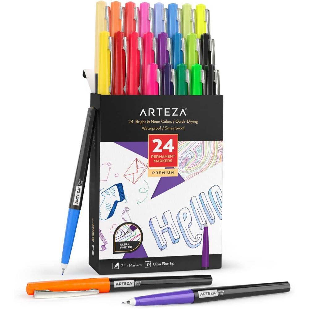 ARTEZA Permanent Markers, 40 Black Pens, Ultra-Fine Tip Paint Pens, Quick-Drying, Water Resistant, for Calligraphy and Note Taking, Office, Classroom(Set 24 Bright & Neon Colors)