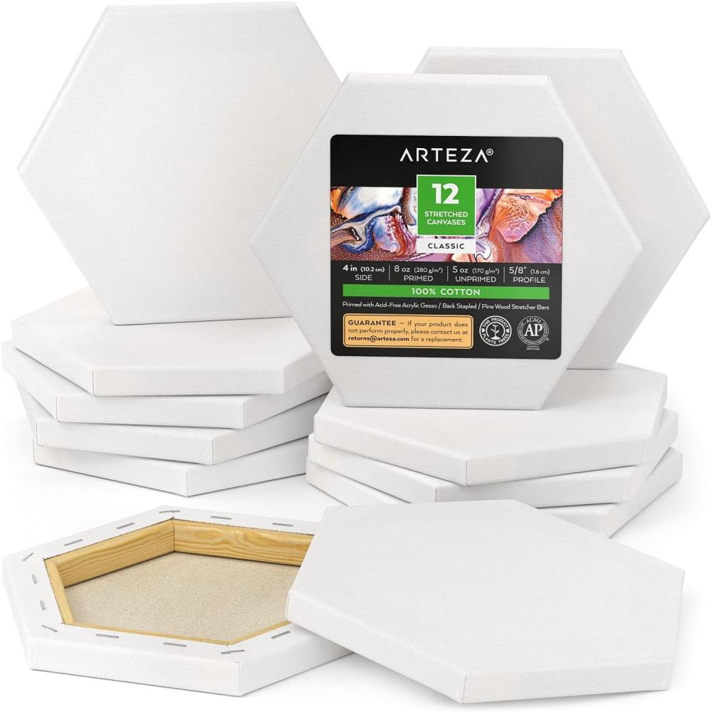 ARTEZA Hexagonal Stretched Canvas, 6 Inch Side, Pack of 9, Blank White Canvas Boards for Acrylic, Oil and Gouache Painting(4 inch)
